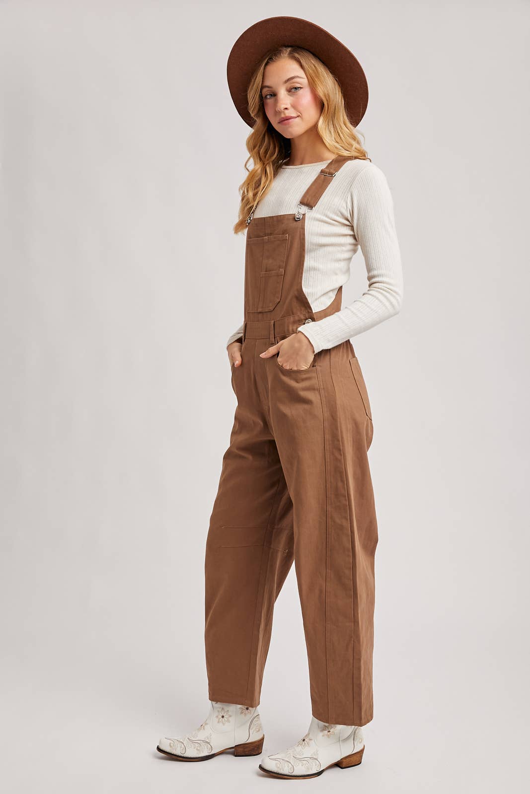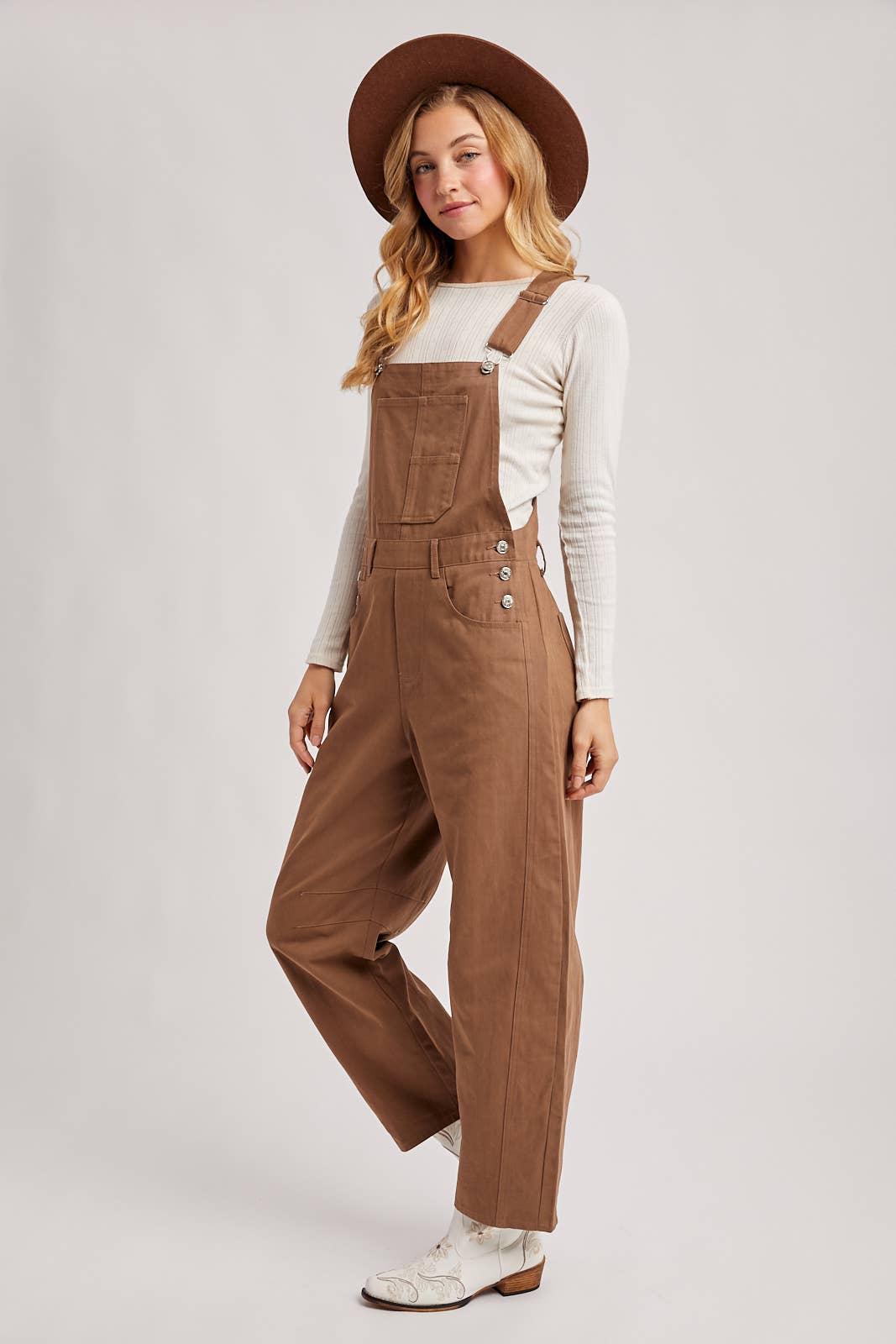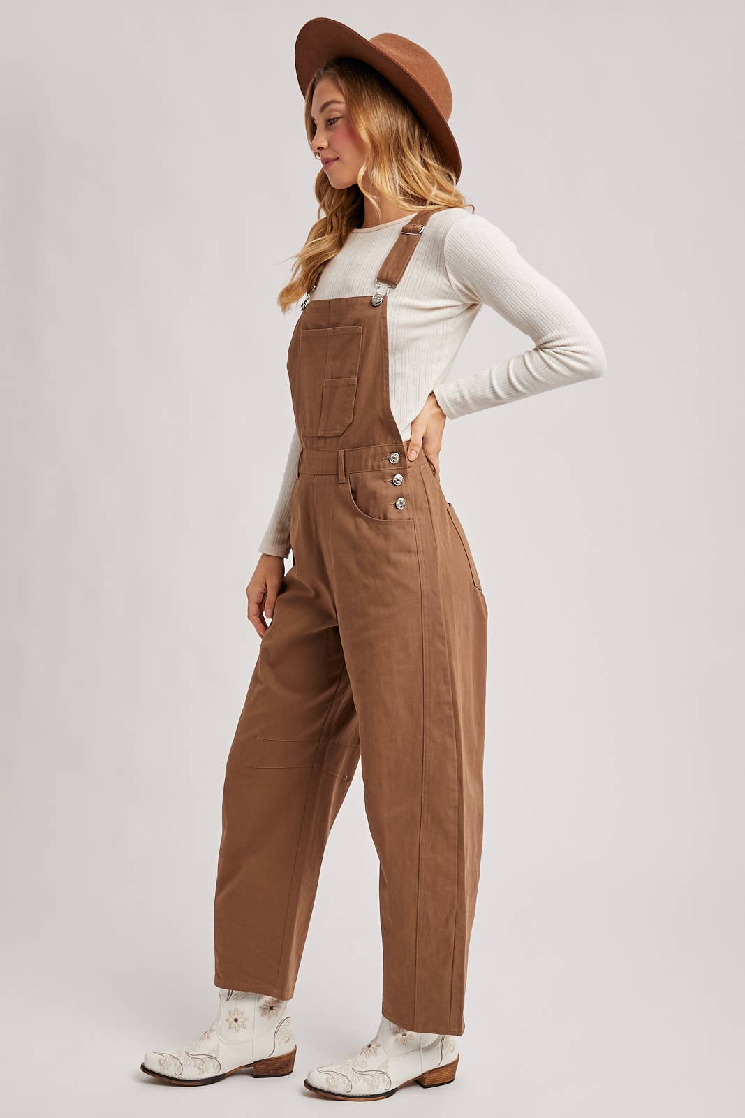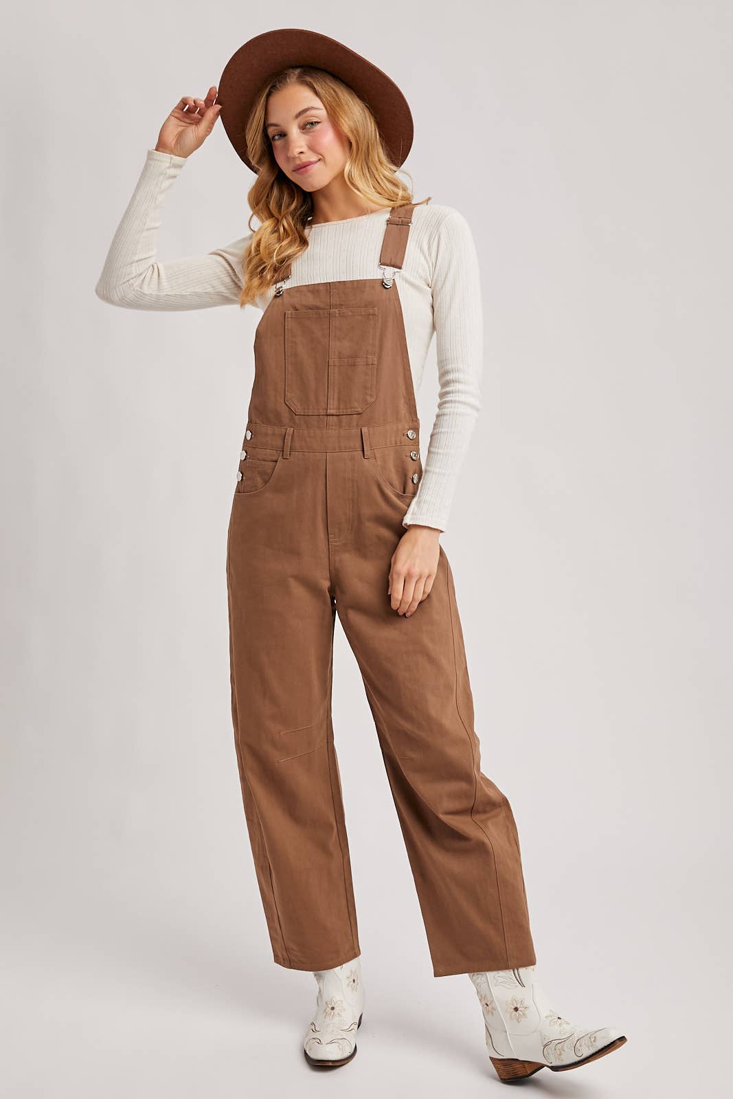 This style is wide-leg overalls made from a sturdy cotton or twill fabric. The overalls feature a bib front with a patch pocket, adjustable straps with silver-toned hardware, and multiple silver-toned buttons on the sides at the waist. Underneath the overalls, she is wearing a white, long-sleeved, ribbed knit top. She's also wearing a brown, wide-brimmed felt hat and white cowboy boots with floral embroidery.