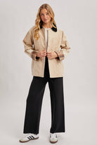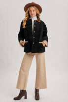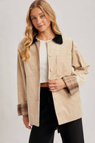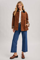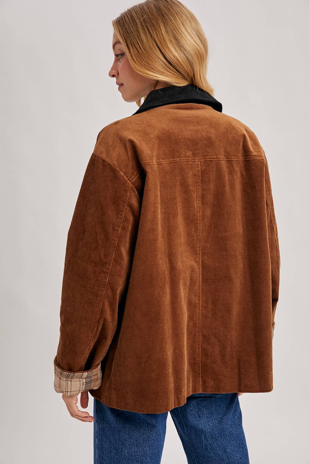 Corduroy button-down barn coat with inner plaid print. This rugged coat features a classic button-down front and is crafted from soft, durable corduroy. The inner plaid print adds a touch of vintage charm and warmth. Perfect for layering over casual outfits, this versatile coat is ideal for outdoor activities or adding a rustic touch to your everyday look.