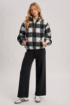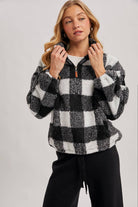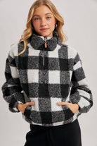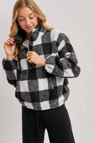 Embrace ultimate coziness with this stylish sherpa fleece pullover, featuring a classic plaid pattern. Designed for maximum comfort, it boasts a high stand-up collar to protect against the chill, a practical quarter-zip neckline with a faux-leather pull tab, and a spacious front kangaroo pocket to keep your hands warm. With its plush, tactile texture and relaxed fit, this pullover is the perfect go-to piece for effortlessly casual and warm cold-weather style.