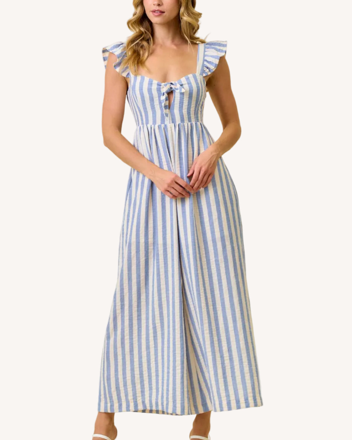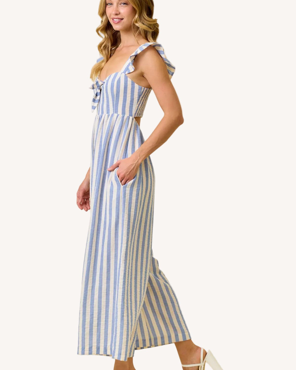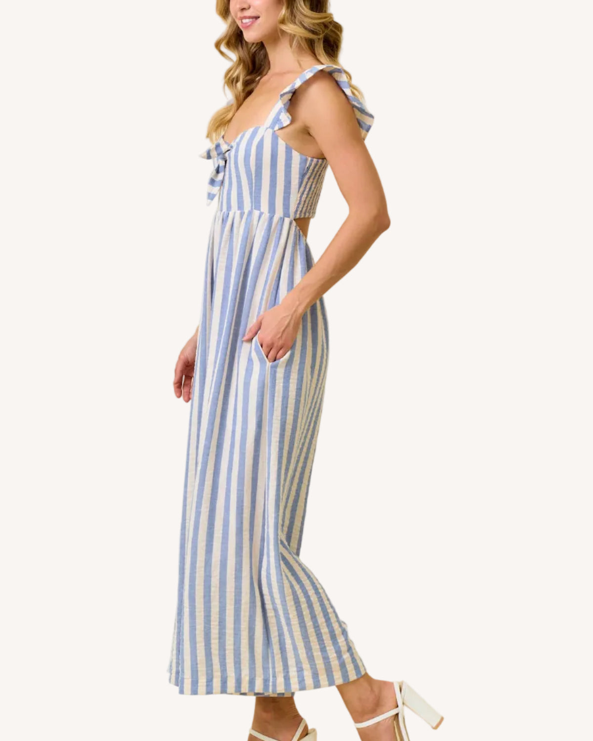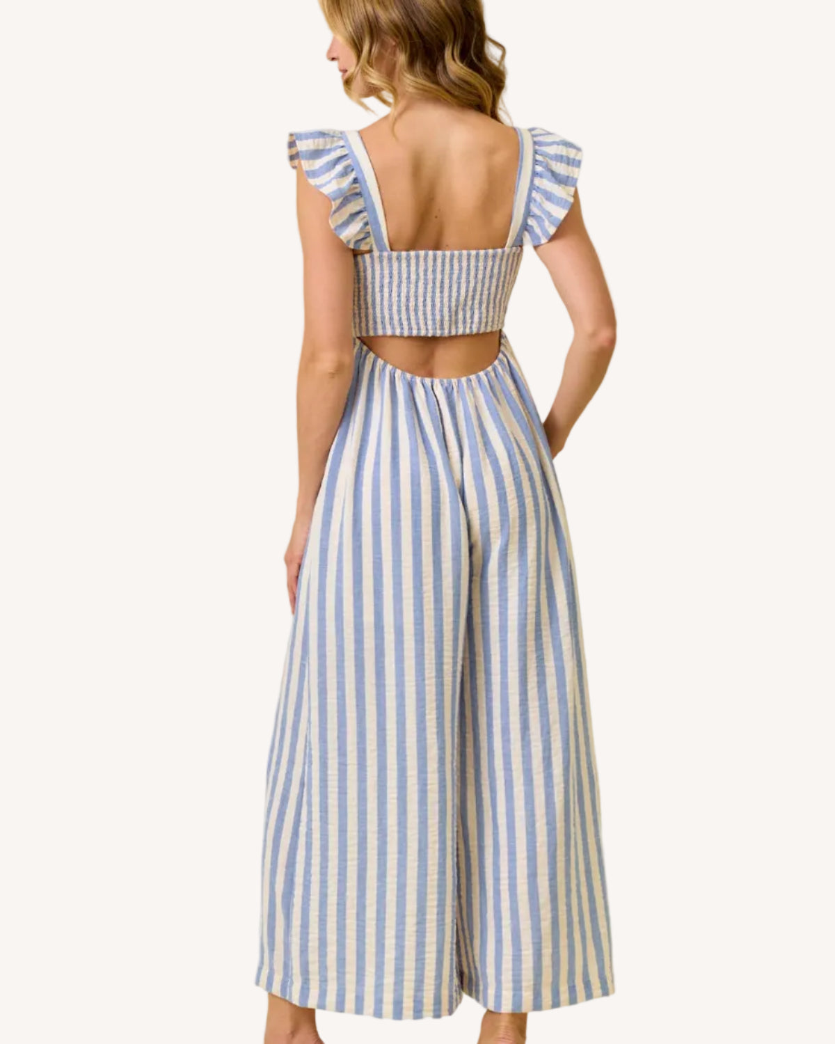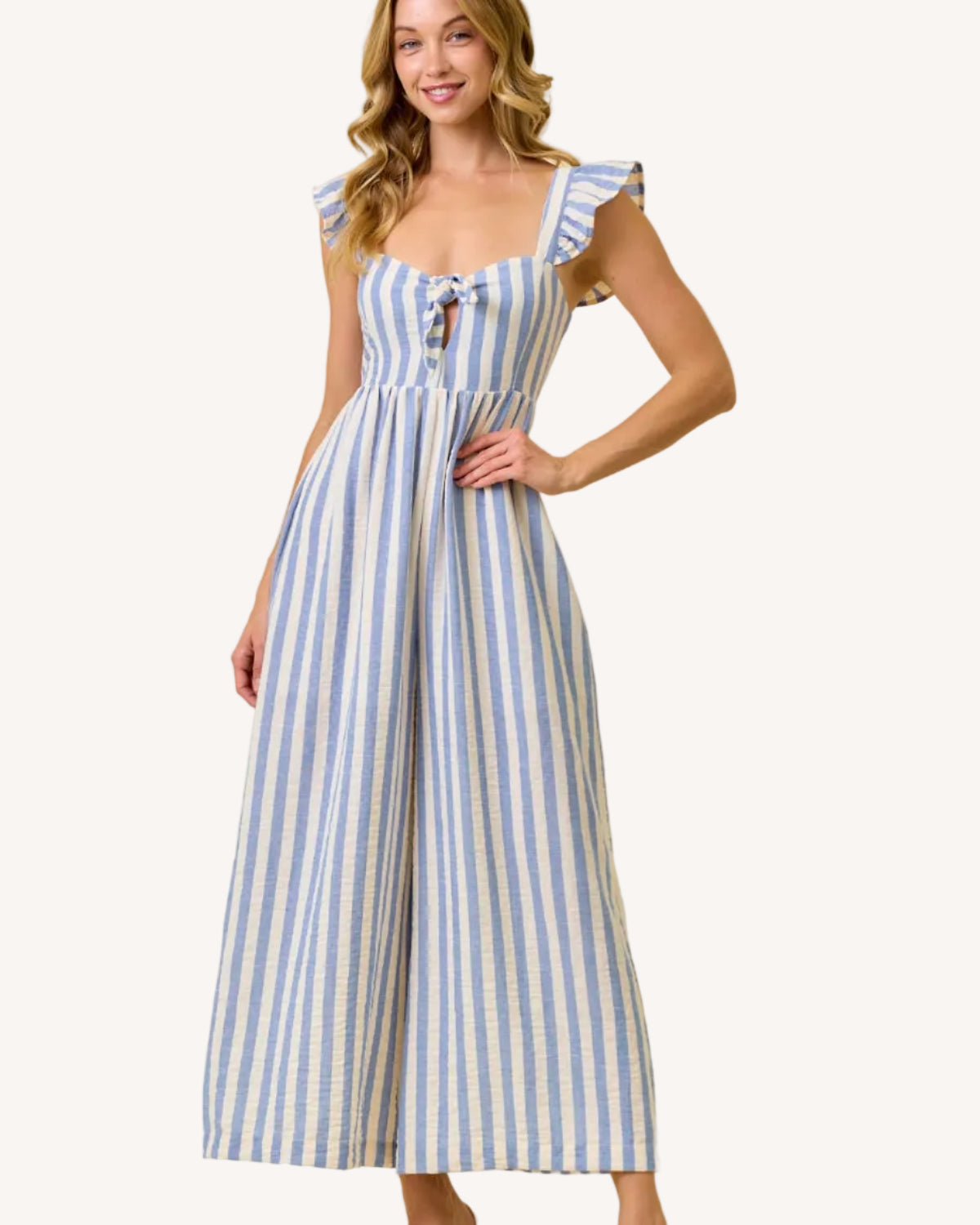 Soft, breathable cotton gauze fabric with vertical stripes for a lengthening effect. Wide leg culotte silhouette with ankle grazing length for easy, airy movement. Sweetheart neckline with front tie detail and small keyhole cutout. Ruffle shoulder straps add a feminine, fluttery touch. Smocked back bodice for comfortable stretch and a flattering fit.