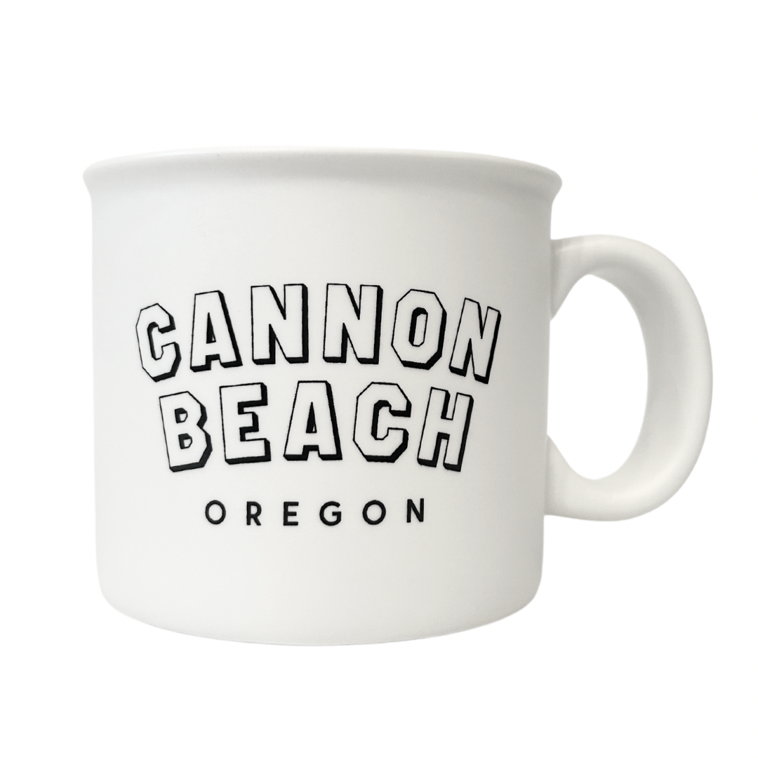 12 oz. Cream chunky camp mug. Happy Place design printed in Charcoal Grey.