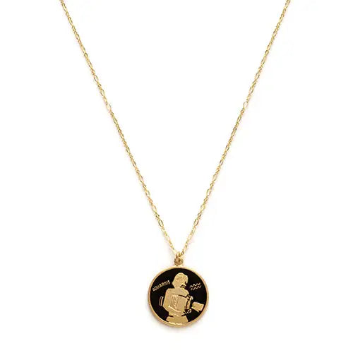 Delivered on a white letter press card, these new zodiac medallions are struck with vintage tooling and feature black enamel, fine barley chain that can be worn at 16" or 18". 14k gold over brass. 100% made in the USA and assembled in Sonoma, CA.