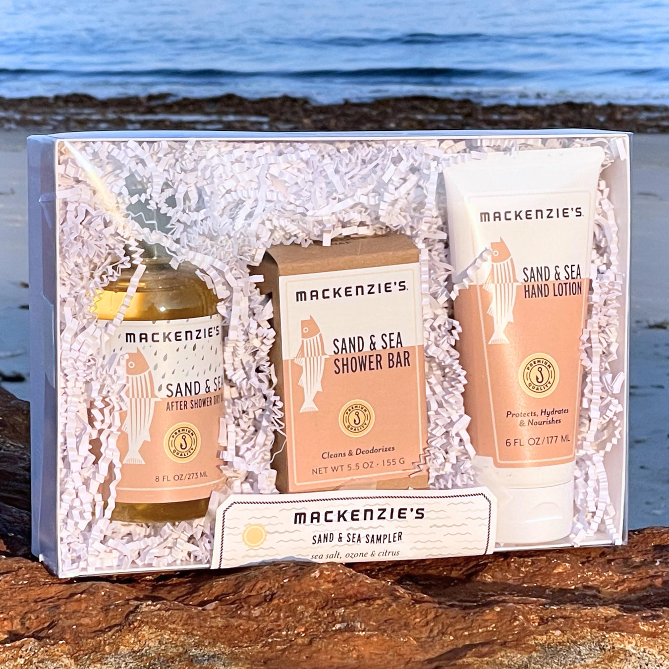 Featuring our 8 oz. Sand & Sea After Shower Dry Oil, 5.5 oz. Sand & Sea Shower Bar and 6 oz. Sand & Sea Hand Lotion, our Sand & Sea Sampler is inspired by warm sand and salty breezes with the fresh scents of sea salt, ozone & citrus. This gift set takes you back to the beach all year-round! Made in New England.