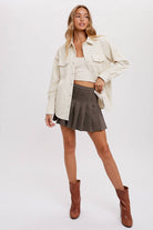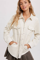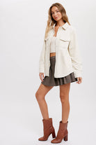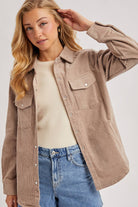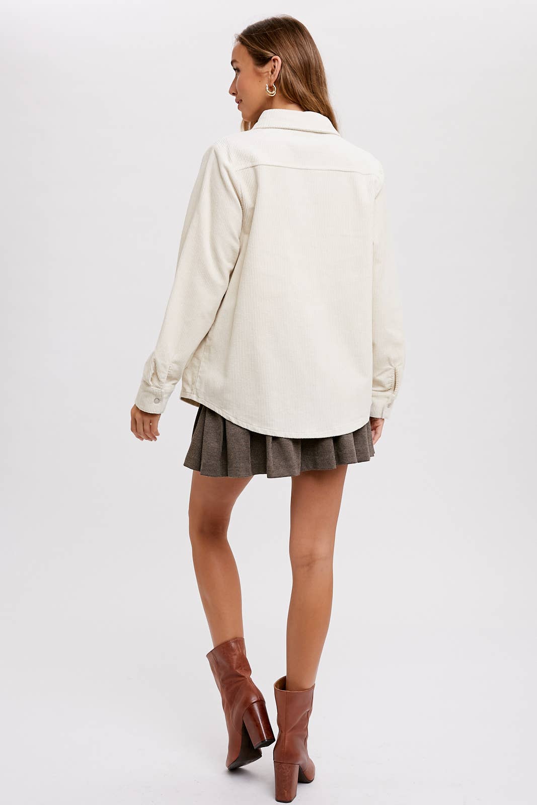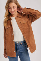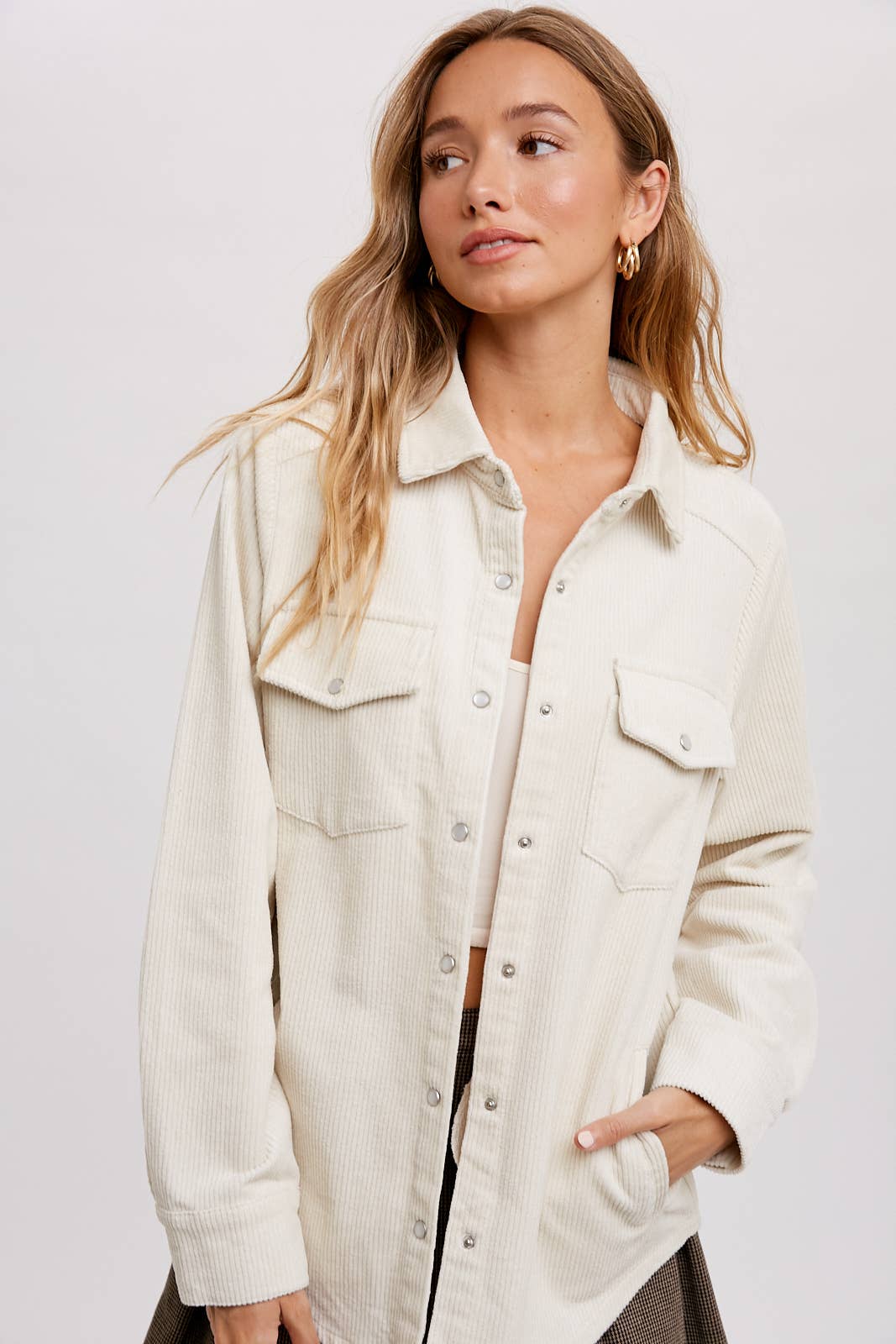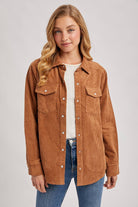 The corduroy button-down shacket with side pockets combines the structure of a jacket with the ease of a shirt, making it a versatile addition to your wardrobe. Made from soft, durable corduroy, this shacket features a button-down front, giving it a classic look that's easy to layer over any outfit. The side pockets add a practical touch, perfect for keeping your hands warm or stashing small essentials. Whether you wear it as a lightweight jacket on cool days or as a layering piece in colder weather, this shacket effortlessly blends style and functionality. Pair it with jeans and a tee for a casual look or layer it over a dress for a more polished ensemble.