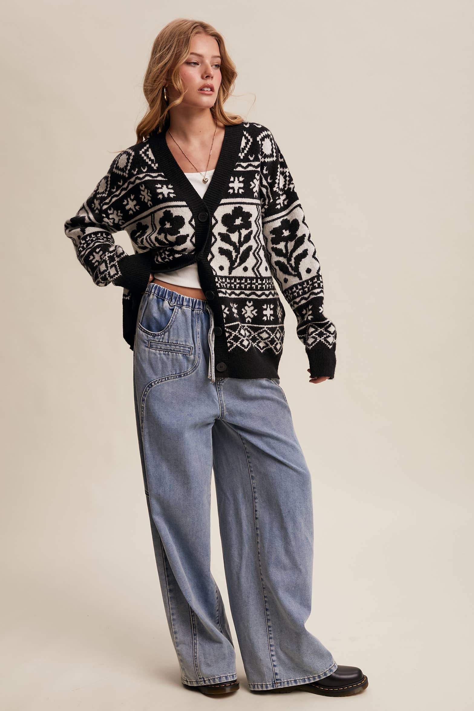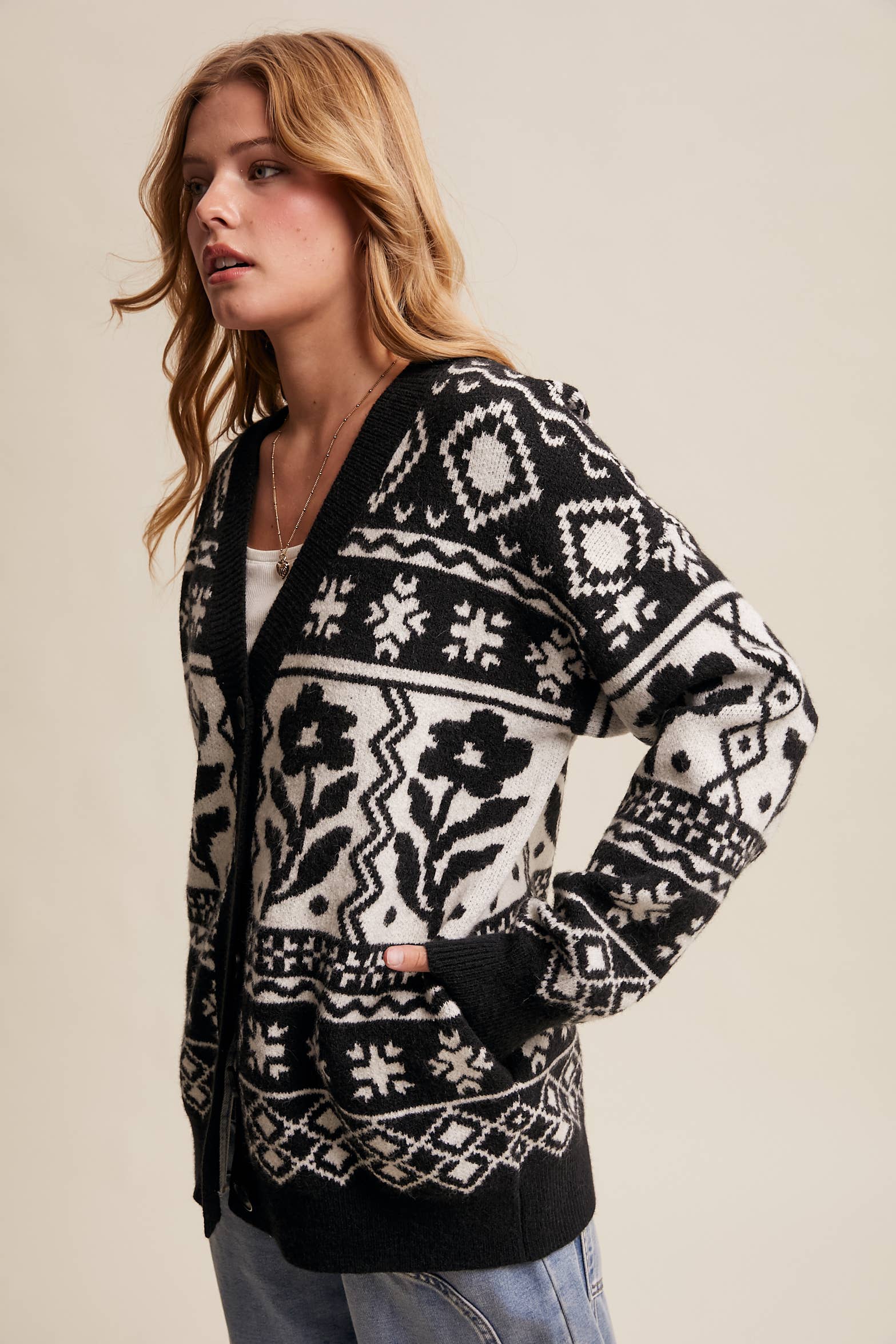 With its nostalgic knit pattern and roomy fit, this cardigan brings cozy Boho vibes to your fall layering game. Perfect over Tops, Dresses, or styled with Jeans and boots for that charming, Western-infused casual feel.