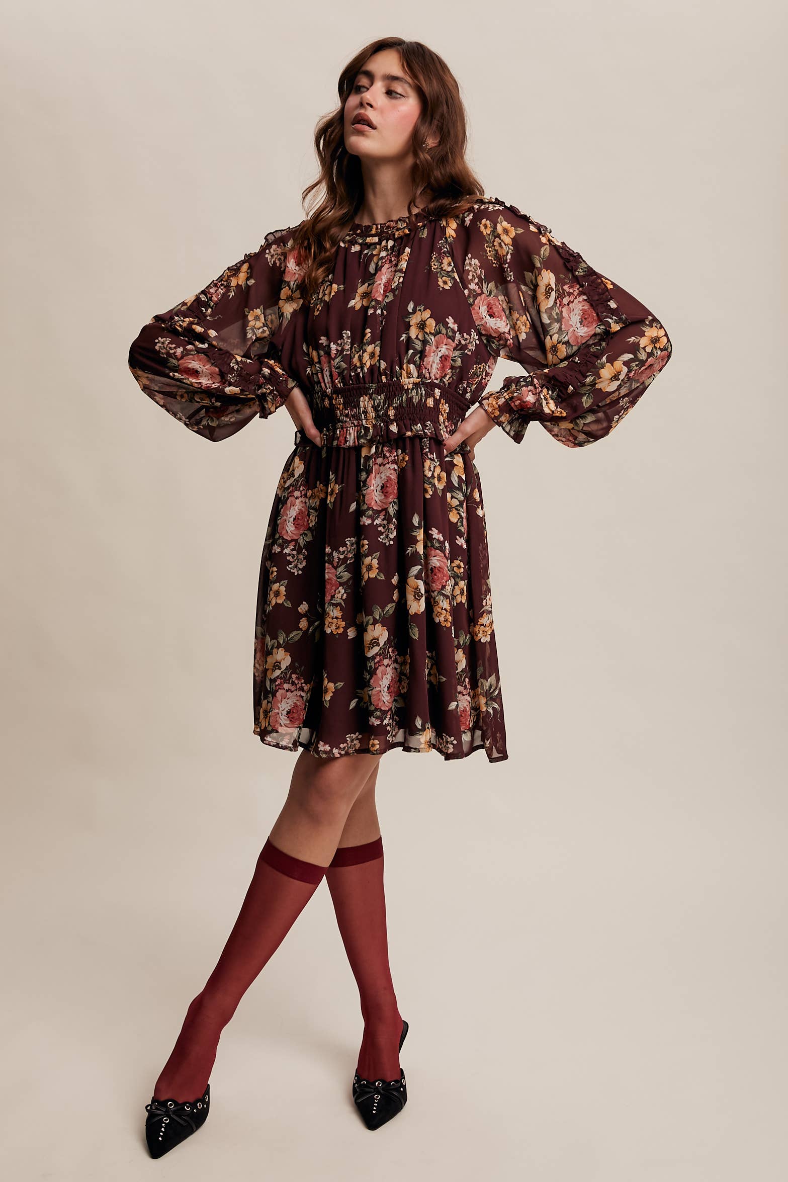 - Sleeves: Long sheer balloon sleeves with ruffle trim and smocked cuffs