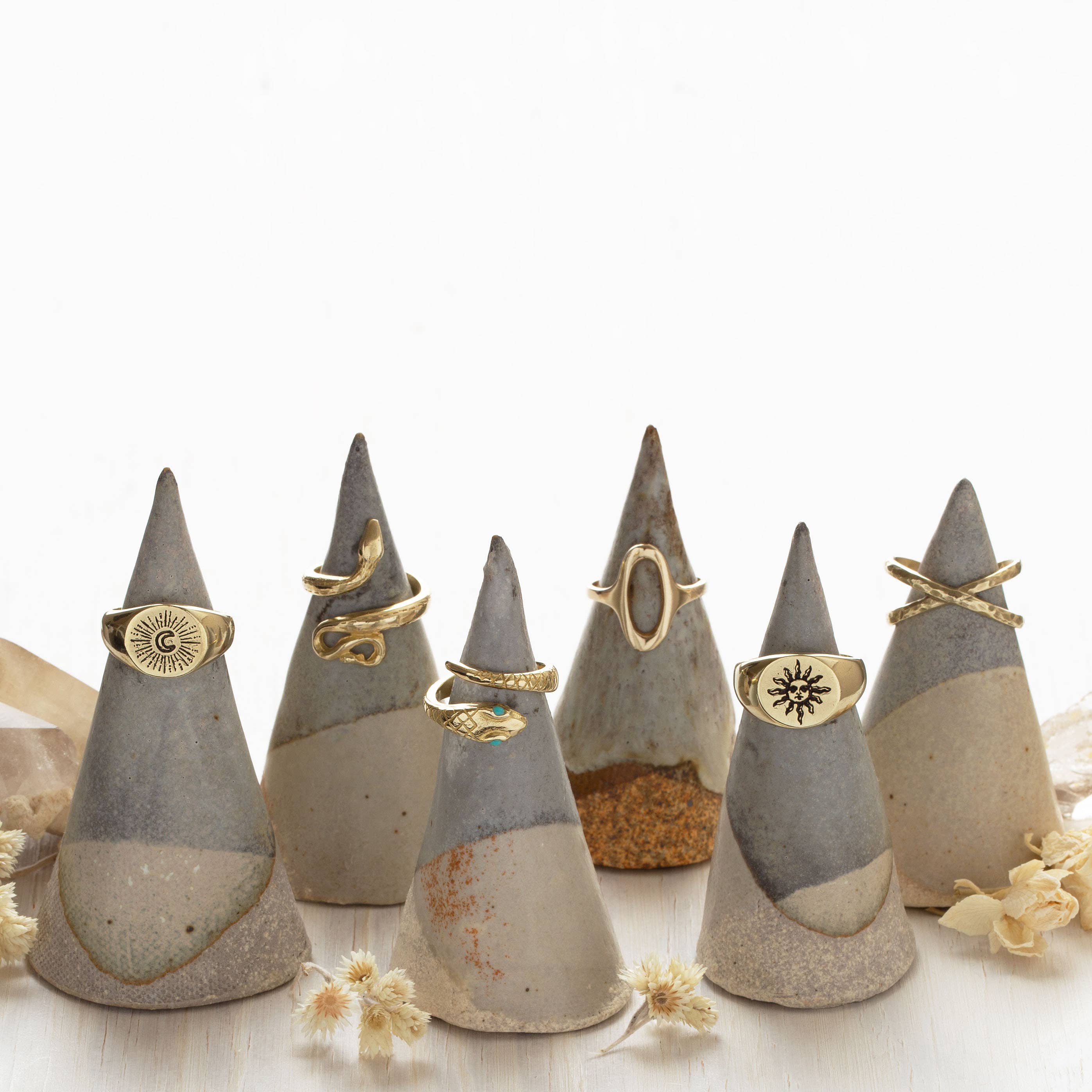 Cast in a warm, earthy jeweler’s brass in a size 7. It adjusts up and down about one size.