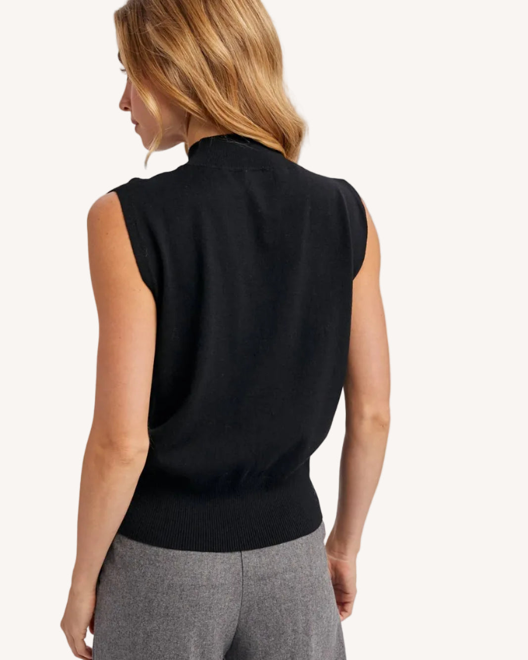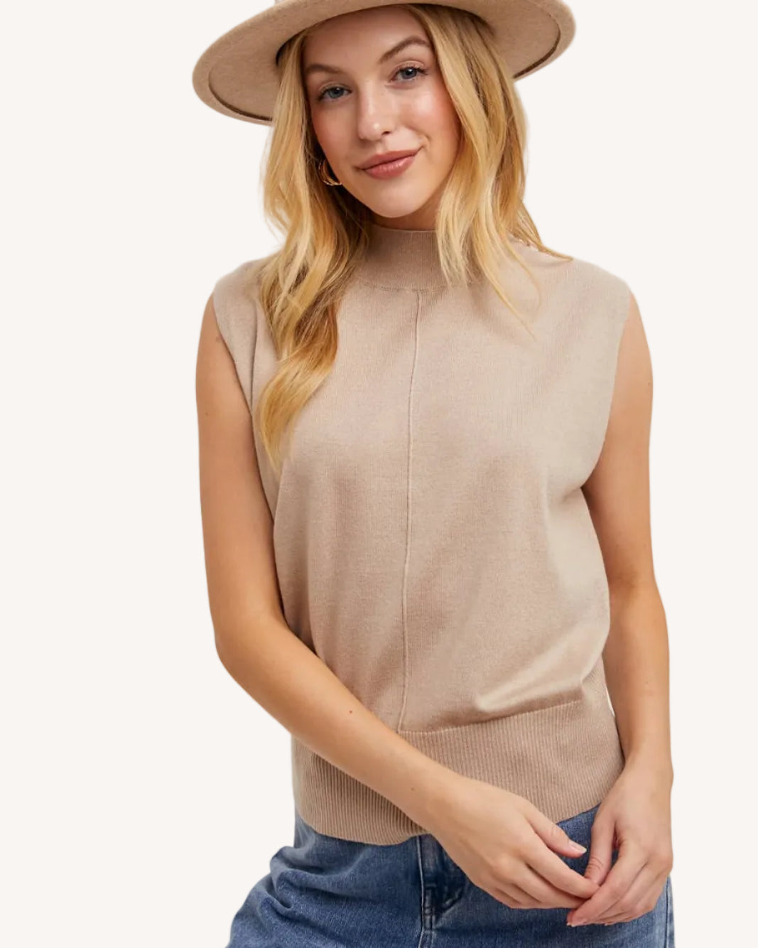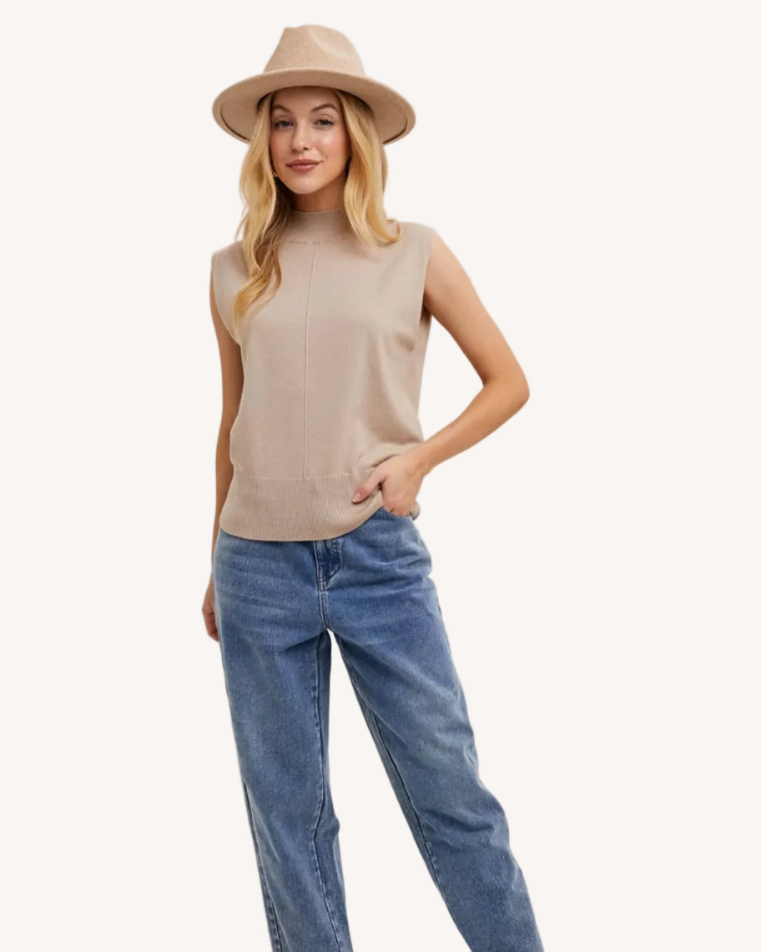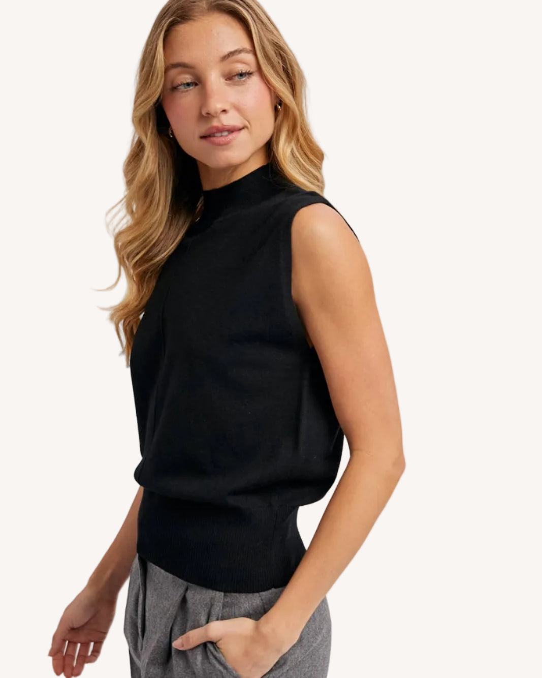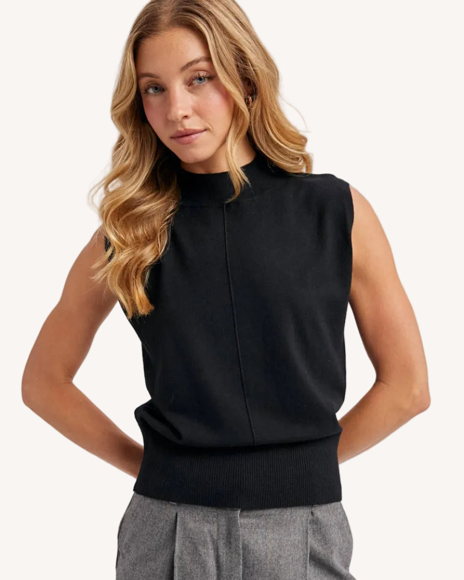 The mock neck knit sleeveless top offers a sleek and modern look, featuring a high neckline that adds a touch of sophistication. Made from soft, breathable knit fabric, this top is perfect for layering or wearing on its own. Its fitted design flatters the figure, making it a versatile piece that can be paired with anything from jeans to skirts, suitable for both casual and more polished outfits.