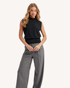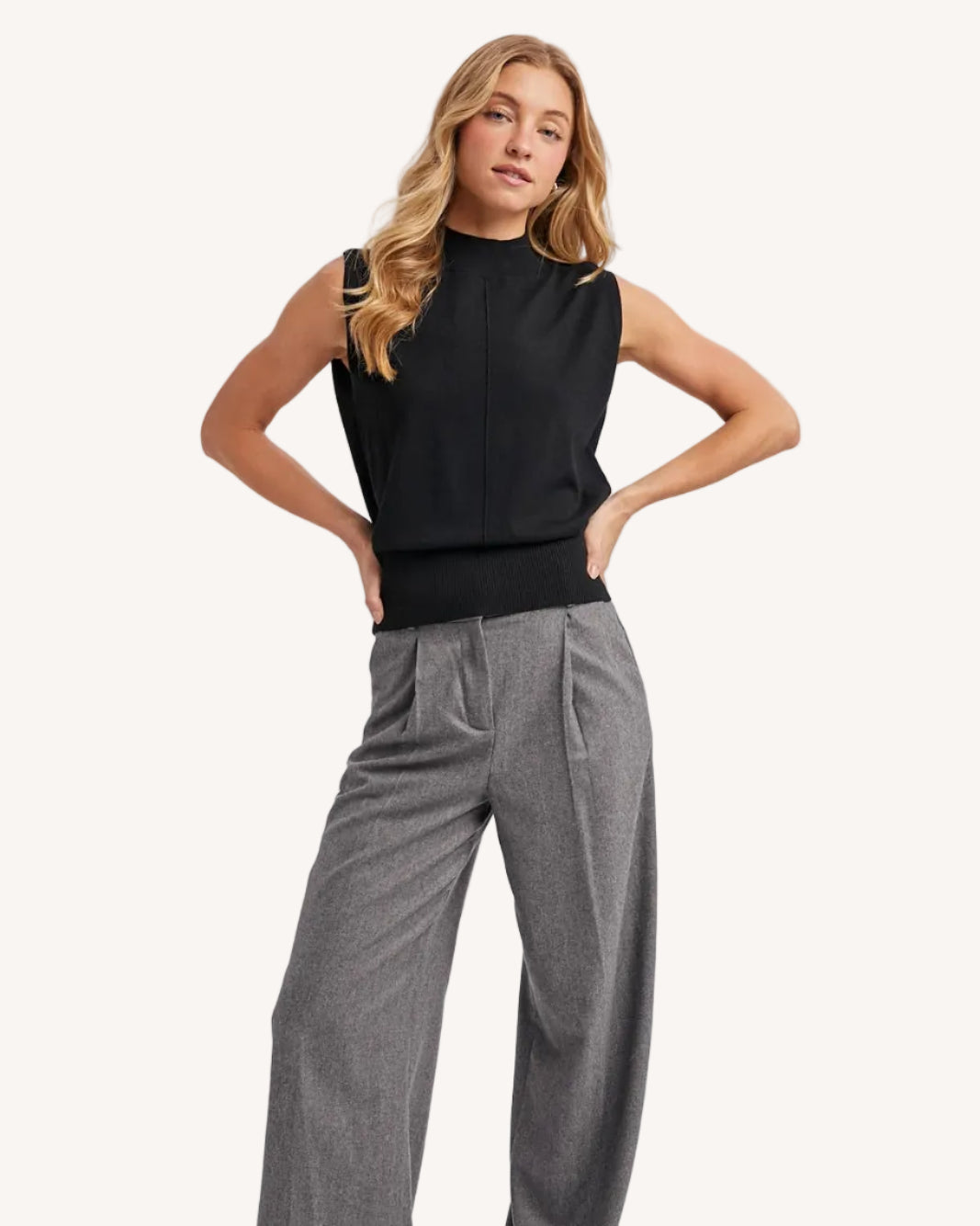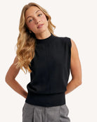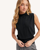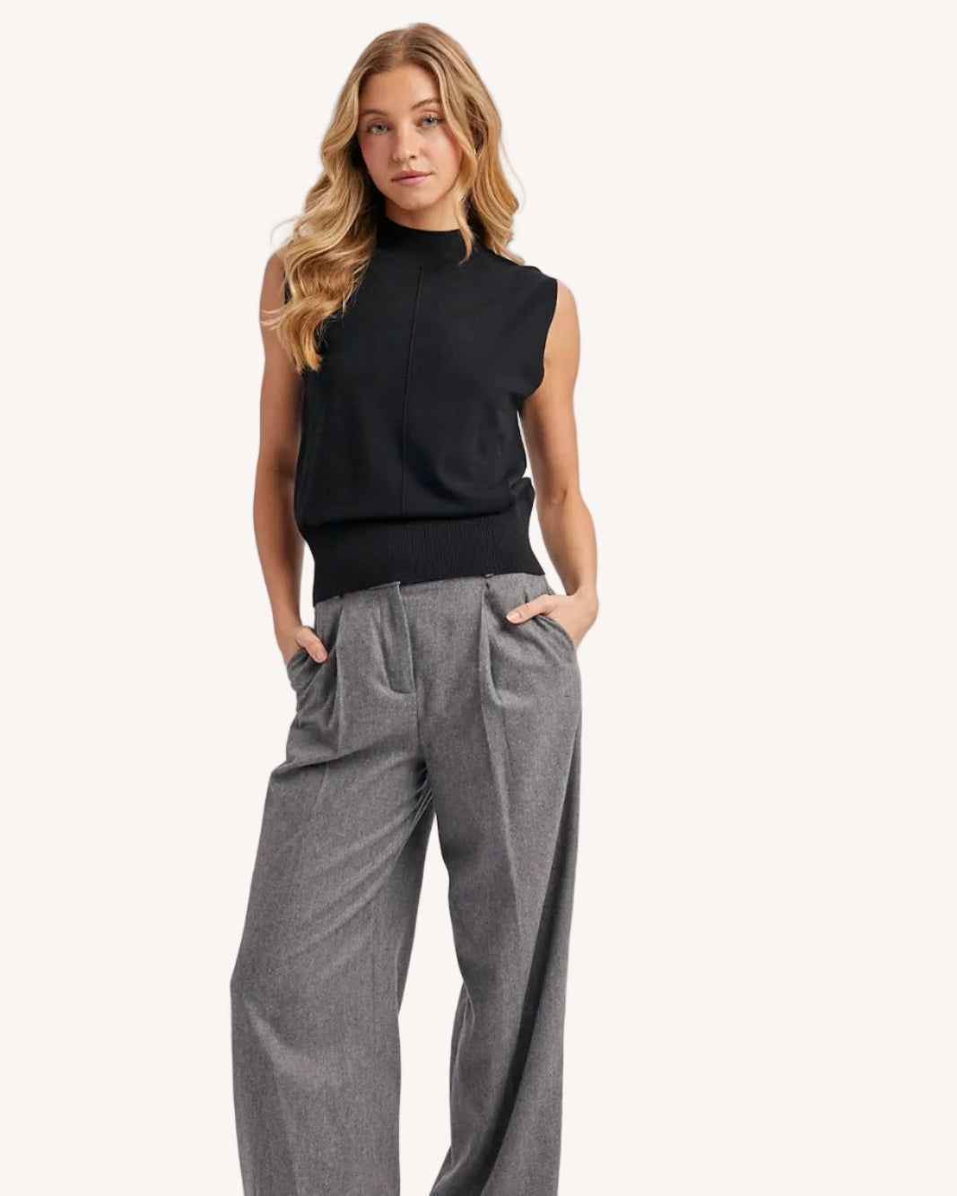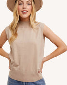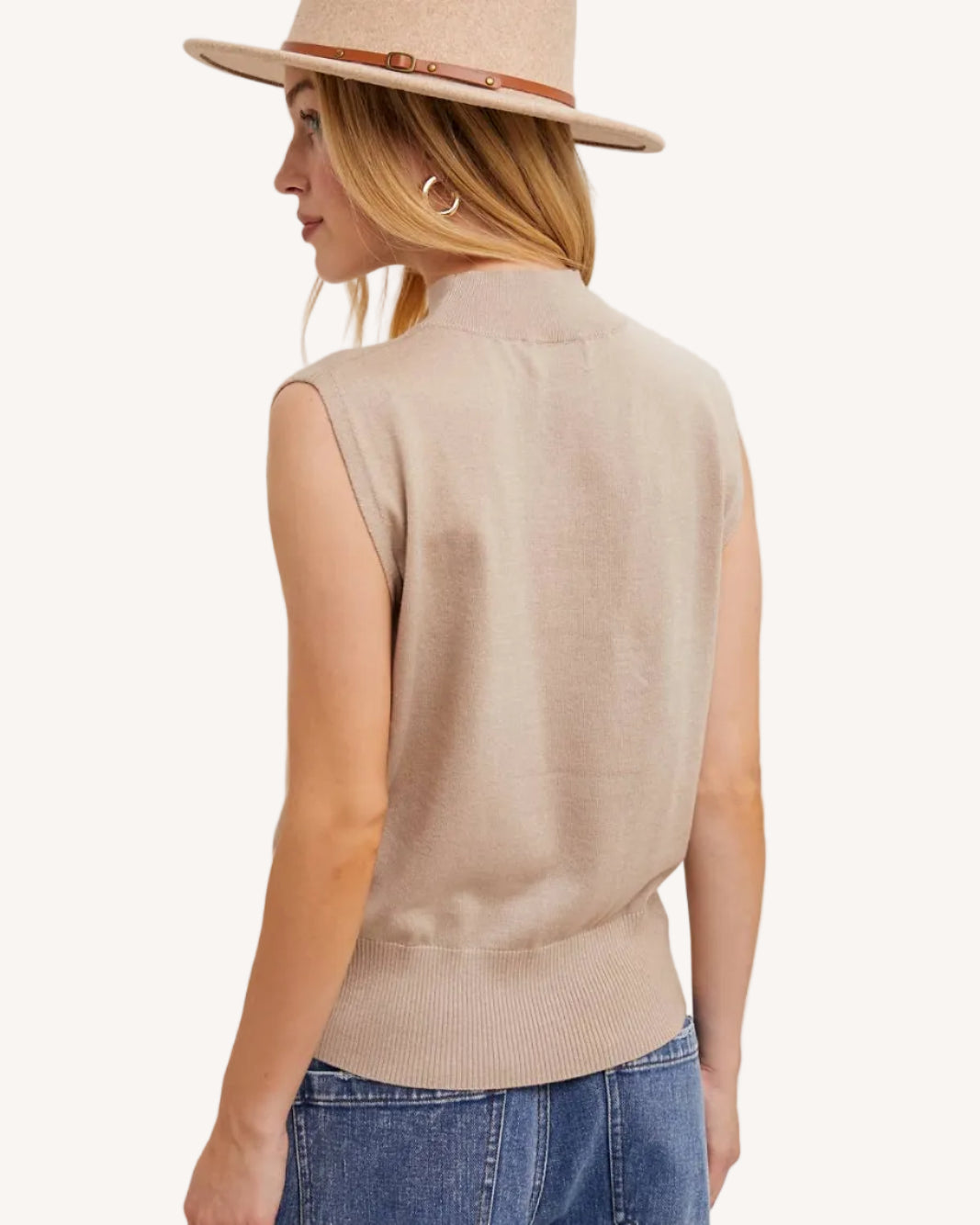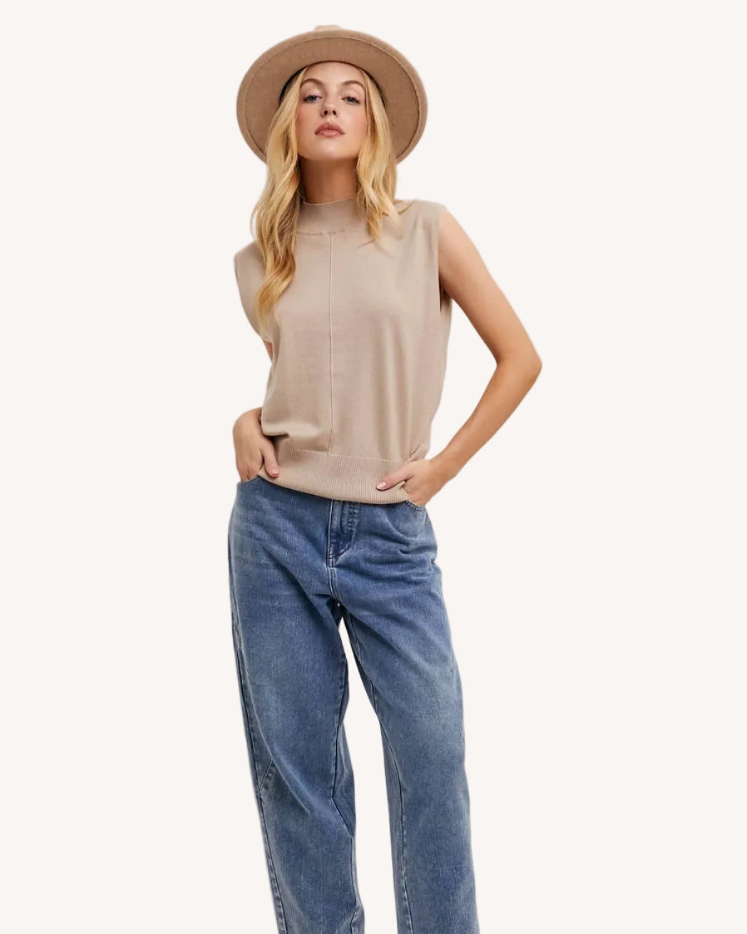 The mock neck knit sleeveless top offers a sleek and modern look, featuring a high neckline that adds a touch of sophistication. Made from soft, breathable knit fabric, this top is perfect for layering or wearing on its own. Its fitted design flatters the figure, making it a versatile piece that can be paired with anything from jeans to skirts, suitable for both casual and more polished outfits.